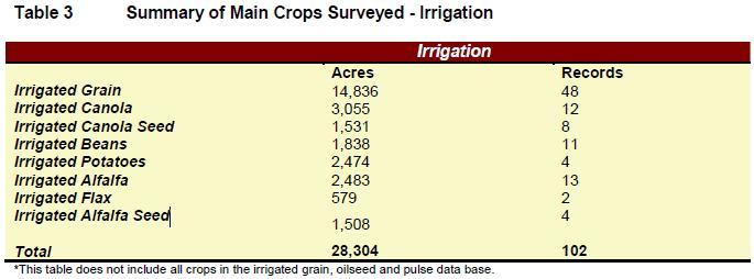 The Specialty Crops accounted for about 1/3 of the total irrigated acres surveyed. In addition to those in the table there were a further 2,815 acres of minor crops such as Meadow Brome, Fescue and Sweetcorn under irrigation. Their sample size was too small however to be meaningful.