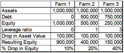Now let’s look at another example of three similar sized farms with different levels of debt. In this example, a 10 % drop in equity, we see how quickly that farm’s solvency is affected. The same would occur if $100,000 of debt was incurred.